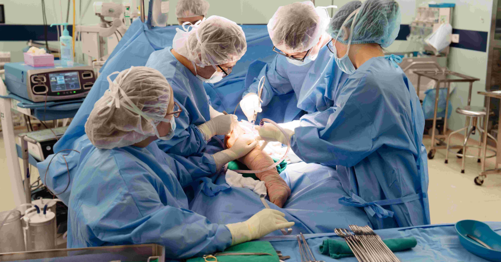 Các bác sĩ phẫu thuật chỉnh hình tại Vinmec thực hiện giai đoạn thứ hai của ca phẫu thuật thay toàn bộ xương đùi. (Nguồn Ảnh Vinmec.)